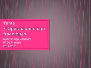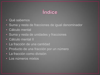 Este documento presenta un resumen de los temas de fracciones cubiertos en 5o grado de primaria. Incluye sumas y restas de fracciones con igual denominador, cálculo mental, fracciones de cantidades, productos de fracciones por números, fracciones como divisiones, y números mixtos. También incluye ejemplos de cómo realizar estas operaciones con fracciones.