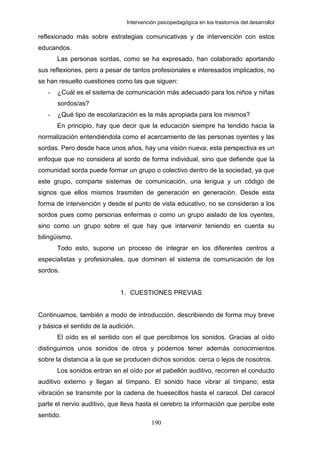 Este documento trata sobre la discapacidad auditiva. Explica que el objetivo es que los profesionales de la educación tengan conocimientos básicos sobre esta discapacidad y sean capaces de realizar una detección primaria. Describe las diferentes clasificaciones de las deficiencias auditivas: cualitativa según la localización, cuantitativa según el grado de pérdida y según el momento de aparición. Explica los conceptos de audición, sonido, intensidad y otros.