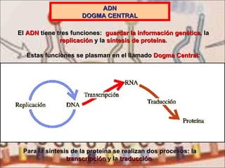 El documento resume los pasos clave en la síntesis de proteínas. Explica que la transcripción convierte la información en el ADN en ARN mensajero, el cual luego es traducido en una proteína a través de la unión del ARN de transferencia con los codones en el ARNm. Detalla los tres tipos de ARN involucrados y cómo la secuencia exacta de aminoácidos codificada en el ADN determina la estructura de cada proteína.