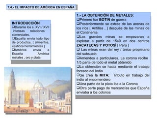 El documento describe el impacto de América en España durante los siglos XVI y XVII. La llegada de metales preciosos como el oro y la plata de América provocó una revolución de los precios en España y Europa. Esto estimuló la economía española pero también causó desequilibrios sociales y el declive de la producción nacional frente a la competencia extranjera. El comercio con América se organizó a través de un monopolio sevillano controlado por la corona española.
