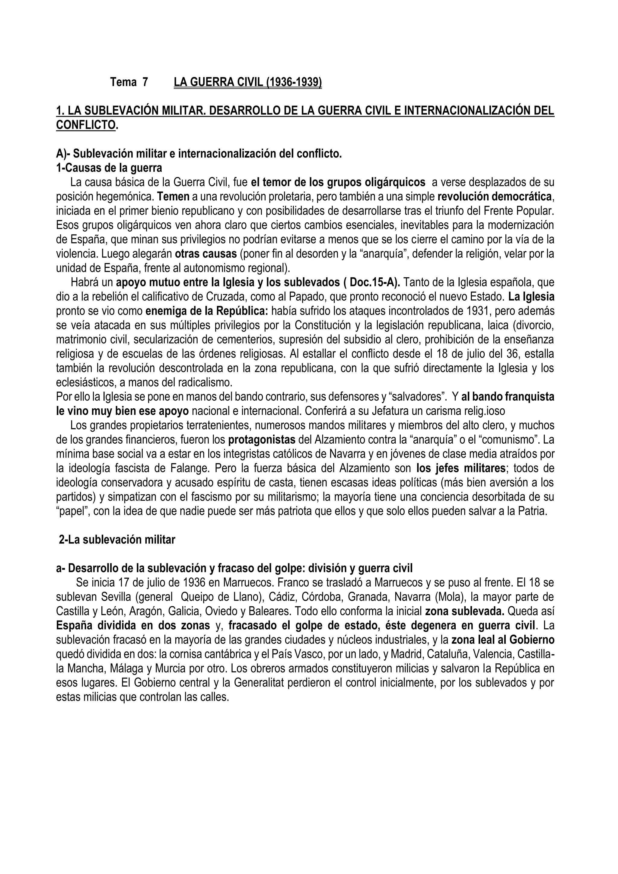 La Guerra Civil Española (1936-1939) fue desencadenada por la sublevación militar de grupos oligárquicos temerosos de ser desplazados por revoluciones sociales. A medida que el conflicto se desarrollaba, tomó una dimensión internacional, con apoyos a ambos bandos, destacando la intervención de los fascistas alemanes e italianos a favor de los sublevados y la ayuda soviética a la República. A pesar de algunos éxitos iniciales, la República sufrió una serie de derrotas clave que culminaron en la rendición y el establecimiento del régimen franquista en 1939.