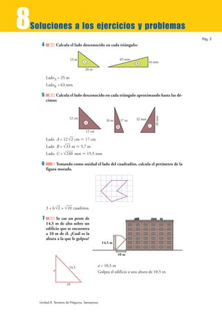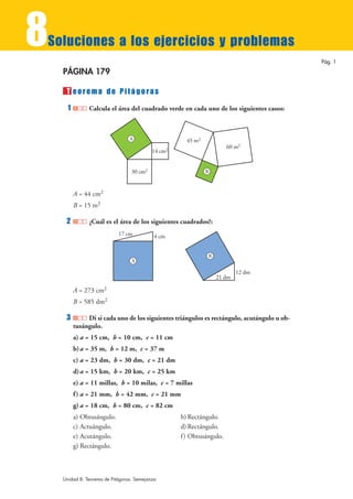 Este documento proporciona soluciones a 24 ejercicios y problemas que involucran el Teorema de Pitágoras y la semejanza de figuras. Los ejercicios resueltos incluyen calcular áreas y perímetros de triángulos, cuadrados, rombos y otras figuras; determinar si triángulos son rectángulos, obtusángulos o agudos; y construir figuras semejantes. También cubre mapas y planos a escala, así como la semejanza de triángulos. Cada solución pro