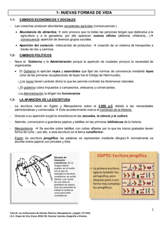 Este documento presenta información sobre las civilizaciones de Mesopotamia y Egipto. Explica los cambios económicos, sociales y políticos que llevaron al surgimiento de estas civilizaciones, incluyendo la aparición de la escritura. Describe aspectos clave de la historia, economía, sociedad y religión de Mesopotamia y Egipto, haciendo énfasis en los pueblos que dominaron cada región y sus principales logros. Además, incluye preguntas y actividades para los estudiantes.