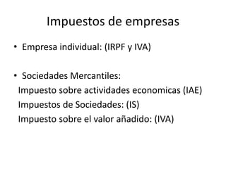 Este documento resume los principales impuestos que afectan a las empresas en España, incluyendo el Impuesto sobre la Renta de las Personas Físicas (IRPF), el Impuesto de Sociedades (IS), el Impuesto sobre el Valor Añadido (IVA) y el Impuesto sobre Actividades Económicas (IAE). También explica conceptos como las retenciones, los pagos fraccionados y el calendario fiscal para empresas.