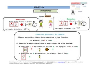 El documento trata sobre la gramática de la lengua española, enfocándose en el género de los sustantivos y la formación de diminutivos. Incluye ejemplos sobre cómo formar el femenino a partir del masculino y las normas ortográficas sobre la separación de palabras. Además, presenta pasos para escribir recetas y continuar cuentos.