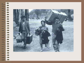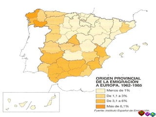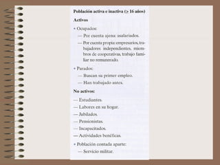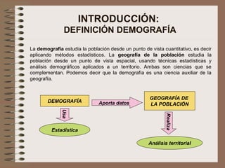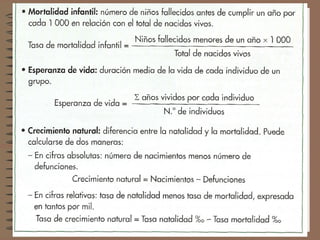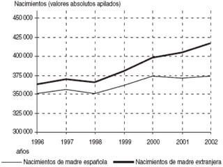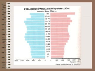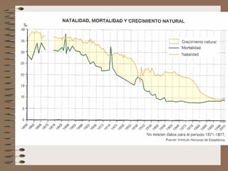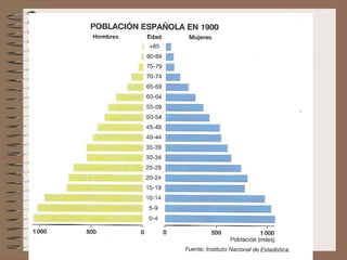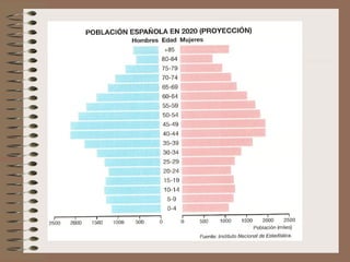 Este documento describe la evolución de la población española. Explica que España pasó por tres regímenes demográficos: antiguo con altas tasas de natalidad y mortalidad, de transición con descenso de la mortalidad y luego de la natalidad, y moderno con bajas tasas de ambas. También analiza factores como la distribución de la población, el crecimiento natural, y las diferencias territoriales en el movimiento de la población a lo largo de la historia.