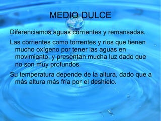 Este documento trata sobre la hidrosfera terrestre. Explica que el agua se encuentra en los tres estados de la materia y los cambios entre ellos. Describe también las principales fuentes de agua dulce y salada en la Tierra, la importancia del agua, y los diferentes medios acuáticos como el marino y de agua dulce.