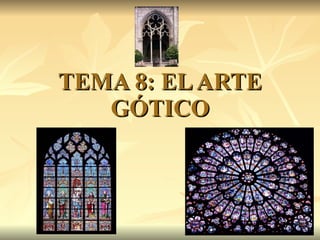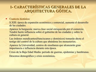 El documento describe las características de la arquitectura gótica, incluyendo sus elementos estructurales como arcos apuntados, bóvedas de crucería y contrafuertes. También discute la influencia del gótico en diferentes catedrales europeas como Notre Dame y Reims. Finalmente, menciona otros edificios civiles góticos como universidades, lonjas y ayuntamientos que surgieron durante este período.
