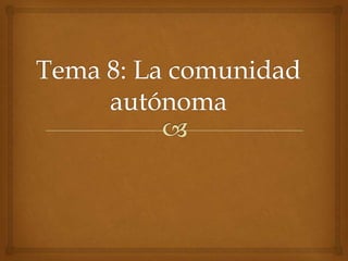 España está organizada en 17 comunidades autónomas y 2 ciudades autónomas. Cada comunidad autónoma tiene su propio parlamento que puede elaborar leyes y gobierno que se ocupa de los problemas y necesidades locales. Además, la mayoría de los servicios que el Estado presta a los ciudadanos como transporte y educación están transferidos a las comunidades autónomas.