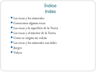 Este documento trata sobre las rocas y los minerales. Explica que las rocas están compuestas de minerales y que se forman, destruyen y mueven continuamente en la corteza terrestre. También describe cómo los magmas del interior de la Tierra ascienden a través de grietas para formar volcanes, y cómo las personas utilizan rocas y minerales con fines de construcción, decoración y para obtener otros materiales.