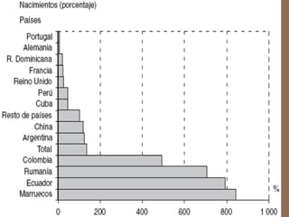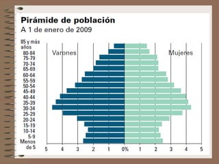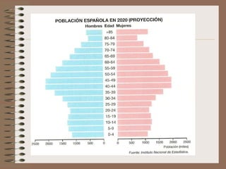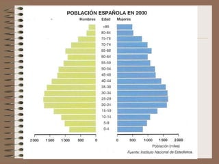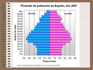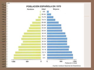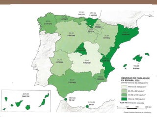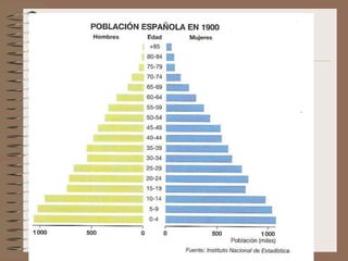 Este documento describe la evolución de la población española desde una perspectiva demográfica. Explica los diferentes regímenes demográficos por los que ha pasado España, desde el antiguo con altas tasas de natalidad y mortalidad, hasta el actual con bajas tasas de ambas. También analiza los factores que han influido en la distribución de la población y los desequilibrios territoriales resultantes, así como las características actuales de la población española y su crecimiento.