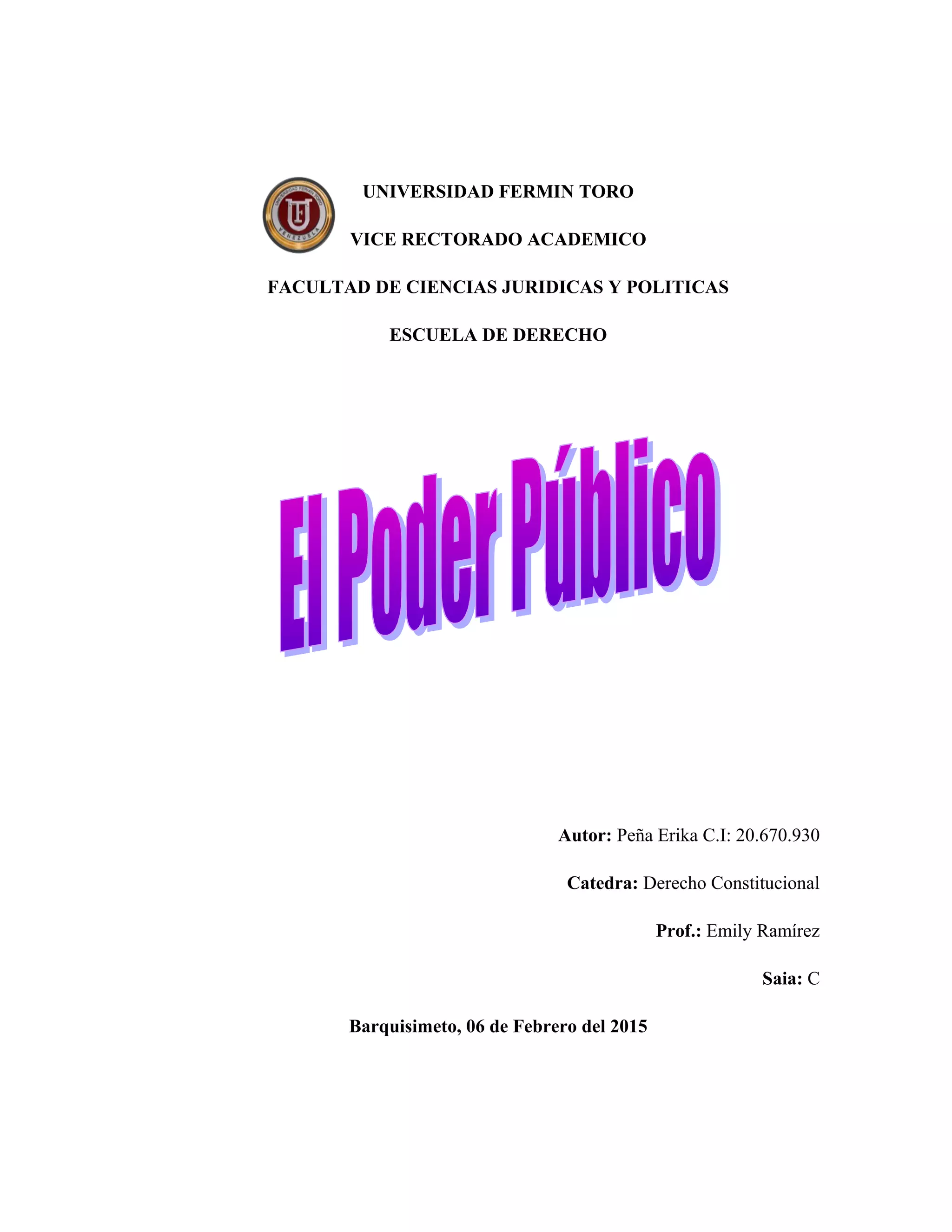 El documento explica el concepto de poder público y cómo está organizado en Venezuela. El poder público nacional se divide en cinco poderes: legislativo, ejecutivo, judicial, ciudadano y electoral. Cada poder tiene funciones específicas como legislar, gobernar, administrar, garantizar la legalidad de los órganos del estado y encargarse de los procesos electorales. El poder público se distribuye a nivel nacional, estadal y municipal.