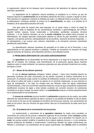El documento describe los principales problemas ambientales derivados de la actividad humana en España, incluyendo la destrucción de bosques, la contaminación de suelos y aguas debido a la agricultura y ganadería intensivas, y la contaminación del aire, suelos y aguas por la industria y desarrollo urbano. La deforestación, causada por talas e incendios, ha reducido los bosques a solo el 20% de su cobertura original. La agricultura y ganadería intensivas usan fertilizantes y purines en exceso, contaminando su