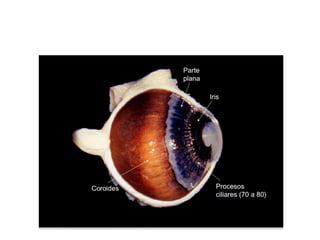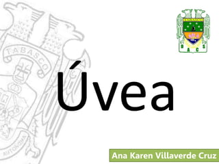 Este documento describe la anatomía y fisiología de la úvea, así como la epidemiología, clasificación y signos clínicos de la uveítis. La úvea está formada por la iris, cuerpo ciliar y coroides. La uveítis es una causa importante de ceguera que se clasifica según su ubicación (anterior, posterior, intermedia o panuveitis) y curso (agudo, crónico o recidivante). Las causas pueden ser endógenas como artritis, sífilis, toxoplasmosis o tuberculosis, o exógenas