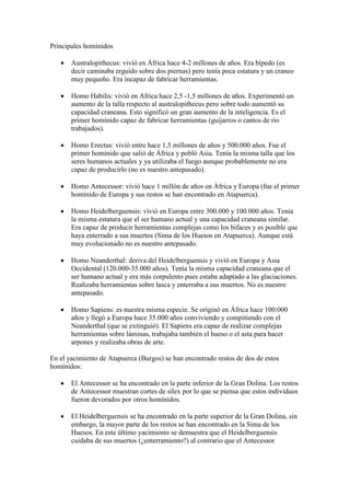 El documento describe la prehistoria, dividiéndola en Paleolítico, Neolítico y Edad de los Metales. Explica que el proceso de hominización dio lugar a diferentes homínidos en África, y que el Homo sapiens emigró de África hace unos 100.000 años. También describe las principales características del Paleolítico, como que los humanos eran cazadores-recolectores nómadas, y del Neolítico, cuando se desarrolló la agricultura y la ganadería y los humanos se vol