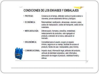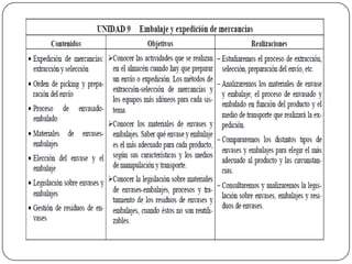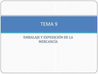 El documento trata sobre el embalaje y expedición de mercancías. Describe los procesos de extracción y selección de mercancías, preparación de envíos, tipos de envases y embalajes, y la legislación sobre envases. Explica las diferentes operaciones de expedición como extraer la mercancía, acondicionarla, controlarla y agruparla por destino antes de enviarla.