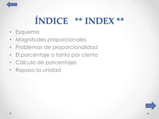 Este documento presenta los conceptos clave de la proporcionalidad y los porcentajes. Explica que dos magnitudes son directamente proporcionales cuando una aumenta o disminuye en la misma proporción que la otra. Detalla dos métodos para resolver problemas de proporcionalidad: reducción a la unidad y la regla de tres. Finalmente, define el porcentaje como una fracción de 100 y explica cómo calcular porcentajes.