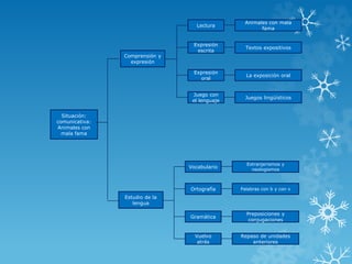 El documento proporciona una lista de temas relacionados con el estudio de la lengua, incluyendo la comprensión y expresión, el vocabulario, la ortografía, la gramática, la lectura, la expresión escrita y oral. Los temas específicos incluyen animales con mala fama, extranjerismos y neologismos, preposiciones y conjugaciones, repaso de unidades anteriores, textos expositivos y juegos lingüísticos.