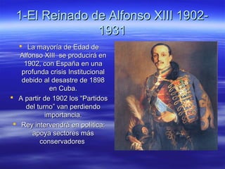 El documento resume el periodo de la historia de España entre 1898 y 1939. Explica que tras la pérdida de las colonias en 1898, España entró en crisis y el reinado de Alfonso XIII estuvo marcado por problemas religiosos, militares y autonómicos. La dictadura de Primo de Rivera entre 1923 y 1930 tampoco solucionó los problemas. Esto llevó a la proclamación de la Segunda República en 1931 y el establecimiento de reformas sociales y políticas hasta que la victoria de la derecha en 1933 dio paso a un periodo