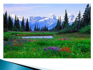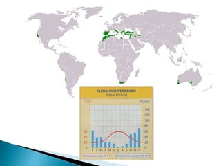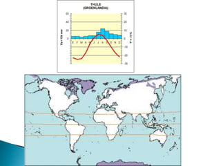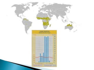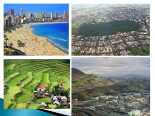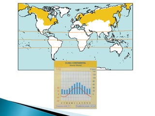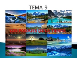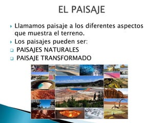El documento describe los diferentes tipos de paisajes naturales y transformados. Distingue entre paisajes naturales como la selva ecuatorial, la sabana tropical y los desiertos, y paisajes transformados por el ser humano como los paisajes rurales, urbanos e industriales. Además, explica las características climáticas y de vegetación de las diferentes zonas climáticas de la Tierra: cálida, templada, fría y de montaña.