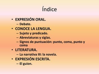 Este documento contiene información sobre varios temas de lengua y literatura. Brevemente resume lo siguiente: