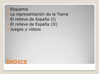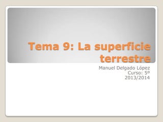Este documento resume el tema 9 sobre la superficie terrestre. Explica la representación de la Tierra a través de mapas y su escala. Describe el relieve de España, incluyendo la meseta central, las montañas que la rodean, y las cinco regiones en que se divide el relieve costero peninsular.