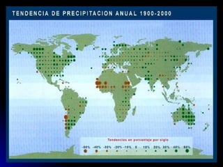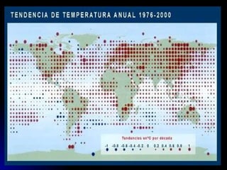 EL CAMBIO CLIMÁTICOEFECTOS DEL CAMBIO CLIMÁTICO Las temperaturas aumentan. A lo lar go del siglo XX ha subido 0,6 grados de media. En Europa ha subido 1 ºC. Los 5 años más calurosos desde 1860 (cuando se empezaron las medi ciones) han tenido lugar en los últimos 10 años. Aumenta el nivel del mar. Siglo XX subida de 10-25 cm. En el año 2100 88 cm afectando a 70 millones perso nas en Europa. Se están fundiendo los casquetes polares. Océano Glaciar Ártico (reduc cion 10%, grosor, pérdida 40%), Groen landia su hielo pasa al mar: 90 km 3 (1966) y 220 km 3 (2005) Desaparecen los glaciares: el 90% están descongelándose. Se espera descongelación del 75% Alpes Suizos en 2050. Pérdida de biodiversidad. No po drán adaptarse a las nuevas Tº C (más sensibles: focas, pingüinos, osos polares, etc...); emigración seres vivos a ecosistemas más frescos. Producción de alimentos en peli gro. Con sólo una ola de calor 2003 (reducción en Europa del 30%). En zonas tropicales y subtropicales (+1,6º C) podrá haber hambruna.