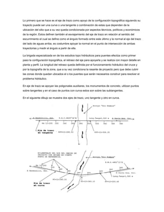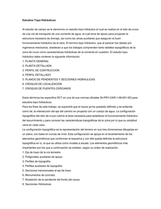 El documento describe los pasos involucrados en un estudio topo hidráulico, el cual se realiza para proyectar estructuras de drenaje en el cruce de una vía de transporte con un cuerpo de agua. El estudio incluye la configuración topográfica del área y características hidráulicas de la corriente, así como plantas, perfiles, nivelaciones y secciones hidráulicas para definir el funcionamiento del cruce. El objetivo final es generar planos con toda la información recolectada en campo que apoyen el diseño