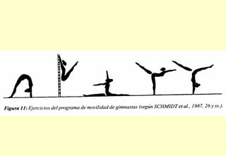 Este documento describe conceptos clave sobre la movilidad articular como la flexibilidad y la elasticidad. Explica factores que limitan la movilidad como la edad y el cansancio, y métodos para entrenar la movilidad como ejercicios estáticos y dinámicos. También cubre beneficios de la flexibilidad y periodización del entrenamiento de la movilidad.