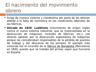 La llegada del movimiento obrero en España se produjo de manera violenta y clandestina debido a la falta de normativa laboral. En la década de 1830 surgió el primer embrión de asociacionismo obrero en Barcelona. En la década de 1840 se fortaleció el movimiento asociacionista a través de sociedades de socorros mutuos. La Primera Internacional llegó a España en 1868 gracias a Giuseppe Fanelli, difundiendo ideas anarquistas que calaron entre el proletariado catalán y el campesinado andaluz. Sin embargo