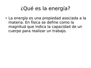 La energía es la capacidad de un cuerpo para realizar un trabajo y existe en varias formas como potencial, cinética, mecánica, sonora, eléctrica, nuclear, luminosa, térmica, química, interna y electromagnética. Las fuentes de energía deben ser capaces de almacenar, transformar y utilizar la energía mediante la tecnología disponible, y se incluyen la energía eléctrica proveniente de centrales elevadas a altos voltajes, los recursos energéticos que se agotan y las renovables
