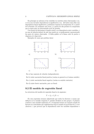 Este documento introduce el concepto de regresión lineal simple. Explica que la regresión lineal estudia la dependencia entre una variable dependiente (Y) y una o más variables independientes (X). Presenta un modelo de regresión lineal donde Y se expresa como una función lineal de X más un error. También describe cómo estimar los parámetros del modelo a través del método de mínimos cuadrados y cómo realizar pruebas de significación sobre los coeficientes.