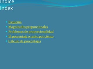 Este documento trata sobre la proporcionalidad y los porcentajes. Explica que las magnitudes son directamente proporcionales cuando se multiplican o dividen por el mismo número. Detalla dos métodos para resolver problemas de proporcionalidad: la reducción a la unidad y la regla de tres. Define el porcentaje como la cantidad de partes de cien. Por último, indica que para calcular un porcentaje se divide la cantidad entre 100 y luego se multiplica por el porcentaje.