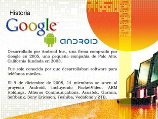 El documento describe la historia y evolución del sistema operativo Android, desarrollado inicialmente por Android Inc. y adquirido por Google en 2005. Se detalla su base en Linux, las características de diversas versiones lanzadas desde 2008, y menciona detalles de su arquitectura y requerimientos para instalación. Además, se incluyen comandos básicos y preguntas para la evaluación del conocimiento sobre Android.