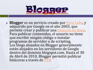 Blogger es una plataforma de publicación de blogs lanzada en 1999 que permite crear y publicar blogs en línea de manera sencilla y gratuita. Los usuarios pueden personalizar la apariencia de sus blogs usando plantillas y pueden publicar contenido ilimitado incluyendo texto, imágenes y videos. Blogger fue adquirido por Google en 2003.