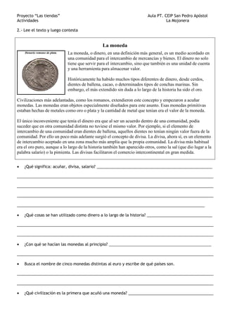 El documento habla sobre el comercio y sus orígenes. Explica que el comercio surgió a finales del Neolítico cuando se descubrió la agricultura y había excedentes de cosechas. Esto llevó al intercambio de productos entre comunidades. Inicialmente se comerciaba mediante el trueque, intercambiando mercancías sin usar dinero. Más tarde surgieron las monedas como medio de pago acordado.