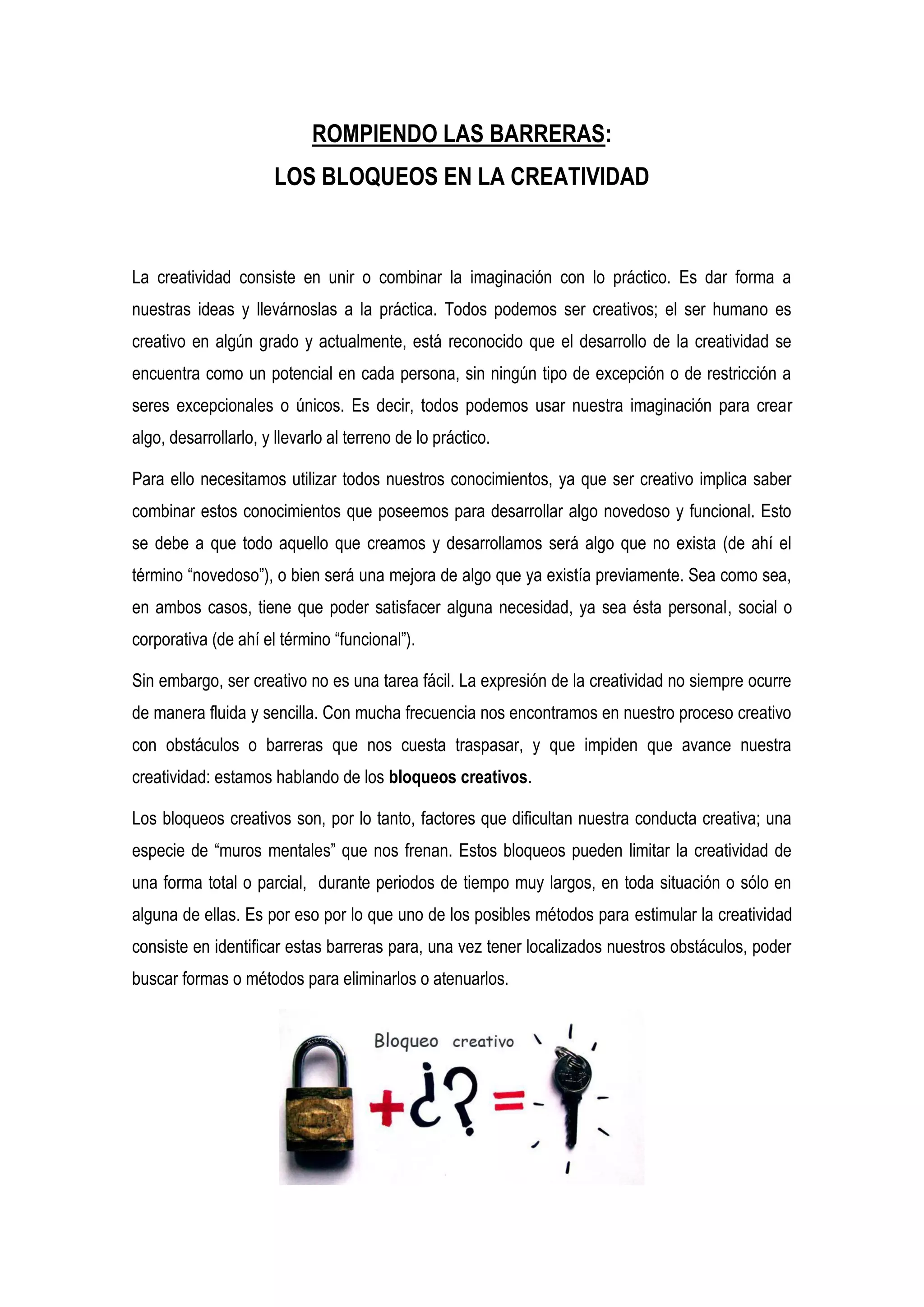 El documento discute los bloqueos a la creatividad. Identifica tres tipos de bloqueos: bloqueos emocionales o personales como el miedo al cambio y al error; bloqueos cognoscitivos o educativos como la falta de conocimientos y la búsqueda de una única solución; y bloqueos culturales como el miedo al rechazo social por ideas diferentes. Para superar los bloqueos, sugiere cambiar paradigmas y acabar con los miedos para reconocer nuestra capacidad creativa.