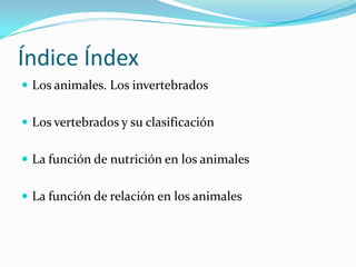 Este documento clasifica y describe brevemente los principales grupos de animales, incluyendo invertebrados como pólipos, medusas, gusanos, equinodermos y moluscos. Luego describe la clasificación de los vertebrados en peces, anfibios, reptiles, aves y mamíferos, señalando algunas de sus características distintivas.