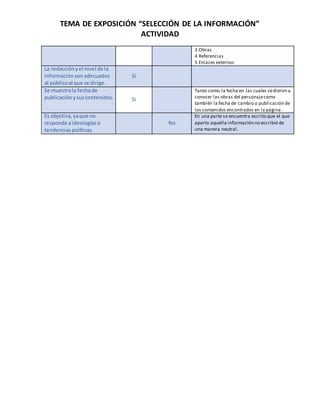 Este documento presenta instrucciones para realizar una actividad de selección de información sobre un personaje famoso utilizando motores de búsqueda de Internet. Los estudiantes deben buscar la biografía de un personaje, evaluar la calidad de la información encontrada según una lista de criterios como la fuente, respaldo institucional, orden y nivel de la información, fecha de publicación, y objetividad. Luego deben reportar los resultados de su búsqueda en un cuadro proporcionado con preguntas sobre cada criterio.