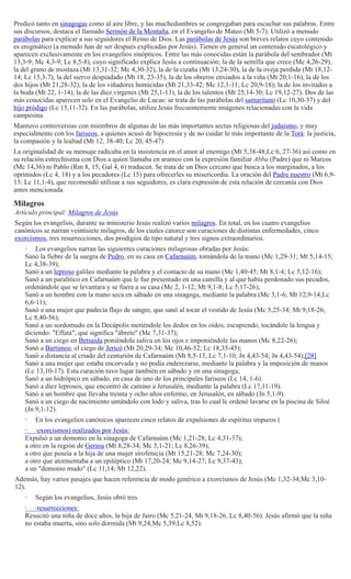 Jesús predicó con parábolas y milagros para enseñar sobre el Reino de Dios. Mantuvo controversias con los fariseos sobre la interpretación de la ley judía. Su mensaje se centró en el amor a Dios y al prójimo. Según los evangelios, Jesús realizó varios milagros como curaciones y resurrecciones que mostraban su autoridad sobre la naturaleza y los demonios.