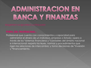 Este documento describe el perfil profesional de un administrador de banca y finanzas, incluyendo sus responsabilidades principales como diseñar políticas financieras, tomar decisiones sobre el capital de una organización, analizar alternativas de financiamiento e inversiones, y evaluar riesgos en los mercados financieros. También se enumeran las habilidades, intereses y personalidad ideales para esta carrera, como ser analítico, bueno con los números, y tener espíritu emprendedor.