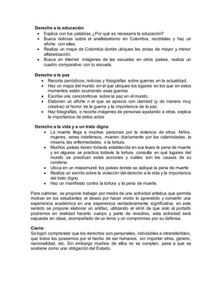 El documento presenta una propuesta para enseñar sobre los derechos humanos en el aula. Primero, se utilizarán videos para que los estudiantes reflexionen y expongan sus puntos de vista. Luego, el docente mediará una discusión sobre el concepto de sujeto de derechos. Después, se realizará un recorrido histórico sobre los derechos humanos. Finalmente, los estudiantes investigarán tres derechos en particular - educación, paz y vida digna - y crearán artefactos como afiches, mapas y manifiest