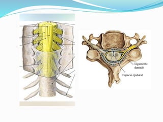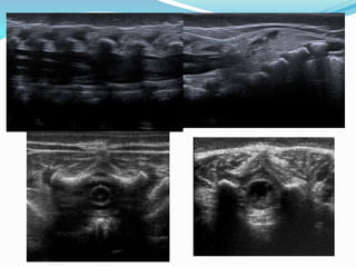 Este documento resume los objetivos y contenidos de una presentación sobre ecografía pediátrica del canal vertebral. Cubre temas como la radiación en pacientes pediátricos, técnicas ecográficas del canal vertebral, anatomía normal y variaciones, embriología, y patologías como disrafismos espinales y médula anclada. El documento proporciona detalles sobre el enfoque ecográfico para evaluar el canal vertebral en niños.