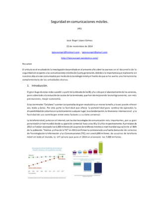 El documento habla sobre la seguridad en las comunicaciones móviles de cuarta generación. Explica que la telefonía móvil se ha vuelto una herramienta importante en la vida diaria. Resume los avances tecnológicos de las redes celulares desde la primera generación analógica hasta la actual cuarta generación digital. Describe aspectos clave de la seguridad en las redes GSM como la autenticación del usuario y el cifrado de comunicaciones.
