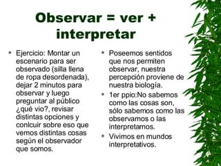 El documento analiza la naturaleza de la observación y cómo nuestra percepción está influenciada por factores internos como nuestro cuerpo, emociones y lenguaje. Explica que no podemos ver la realidad de forma objetiva, sino que observamos el mundo a través de lentes interpretativas determinadas por estas características internas. También distingue entre aprendizaje de primer y segundo orden, y cómo este último permite aprender de la experiencia y evitar cometer los mismos errores.