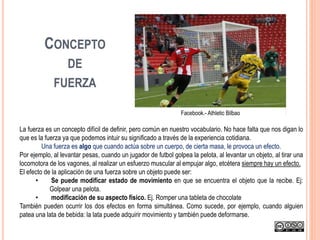 El documento aborda el concepto de fuerza en física, definiéndola como una acción que provoca cambios en el estado de movimiento o forma de un cuerpo. También explica la clasificación de las fuerzas en fuerzas de contacto y a distancia, y detalla cómo se mide la fuerza en diferentes unidades del sistema internacional. Finalmente, se describe la ley de Hooke y cómo calcular la elasticidad de un muelle usando ejemplos prácticos.