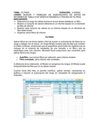 El documento describe cómo aplicar filtros en Excel para buscar y trabajar con un subconjunto de datos en hojas de cálculo o informes dinámicos. Explica cómo usar filtros básicos y avanzados para ocultar filas que no cumplen con ciertos criterios y solo mostrar las filas relevantes. También incluye ejemplos y actividades prácticas para aplicar filtros.