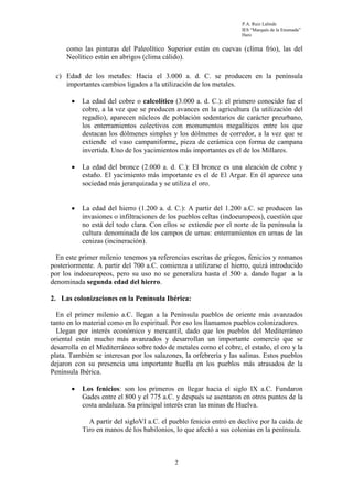 Este documento resume la prehistoria y la historia antigua de la Península Ibérica. Comienza con una breve descripción de los primeros pobladores durante la Prehistoria, incluido el Paleolítico, Neolítico y Edad de los Metales. Luego describe las colonizaciones fenicias, griegas y cartaginesas en la costa durante el primer milenio a.C., y su influencia en la introducción de nuevas tecnologías y cultivos. Finalmente, resume los principales pueblos prerromanos como los tartesios