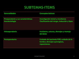 Este documento cubre varios temas relacionados con la perioperatoria y anestesiología, incluyendo el preoperatorio, la inducción a la anestesia, técnicas anestésicas como la anestesia inhalatoria y regional, el intraoperatorio, el manejo del dolor, y el postoperatorio. Se discuten conceptos como la evaluación del riesgo quirúrgico, la terapia antitrombótica, posibles complicaciones como las infecciones del sitio quirúrgico, y agentes anestésicos comúnmente usados.