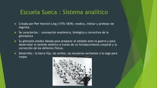 Este documento describe las principales escuelas de educación física: la escuela sueca, alemana y francesa. La escuela sueca se centra en la anatomía y corrección de defectos físicos. La escuela alemana enfatiza la fuerza y disciplina. Y la escuela francesa promueve una aproximación natural a los ejercicios físicos para mejorar la salud y agilidad.